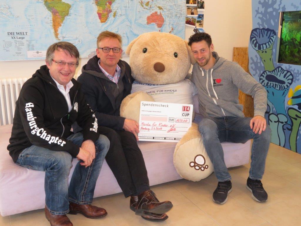 Dierk Schulz und Schnecke haben den Scheck über 1.650,00 Euro an „Hände für Kinder“ übergeben. Das Geld fließt in die Finanzierung des Kupferhofs, ein Haus in Hamburg Wohldorf-Ohlstedt. Dieses Haus bietet ein Kurzzeit-Zuhause für behinderte Kinder und deren Familien.